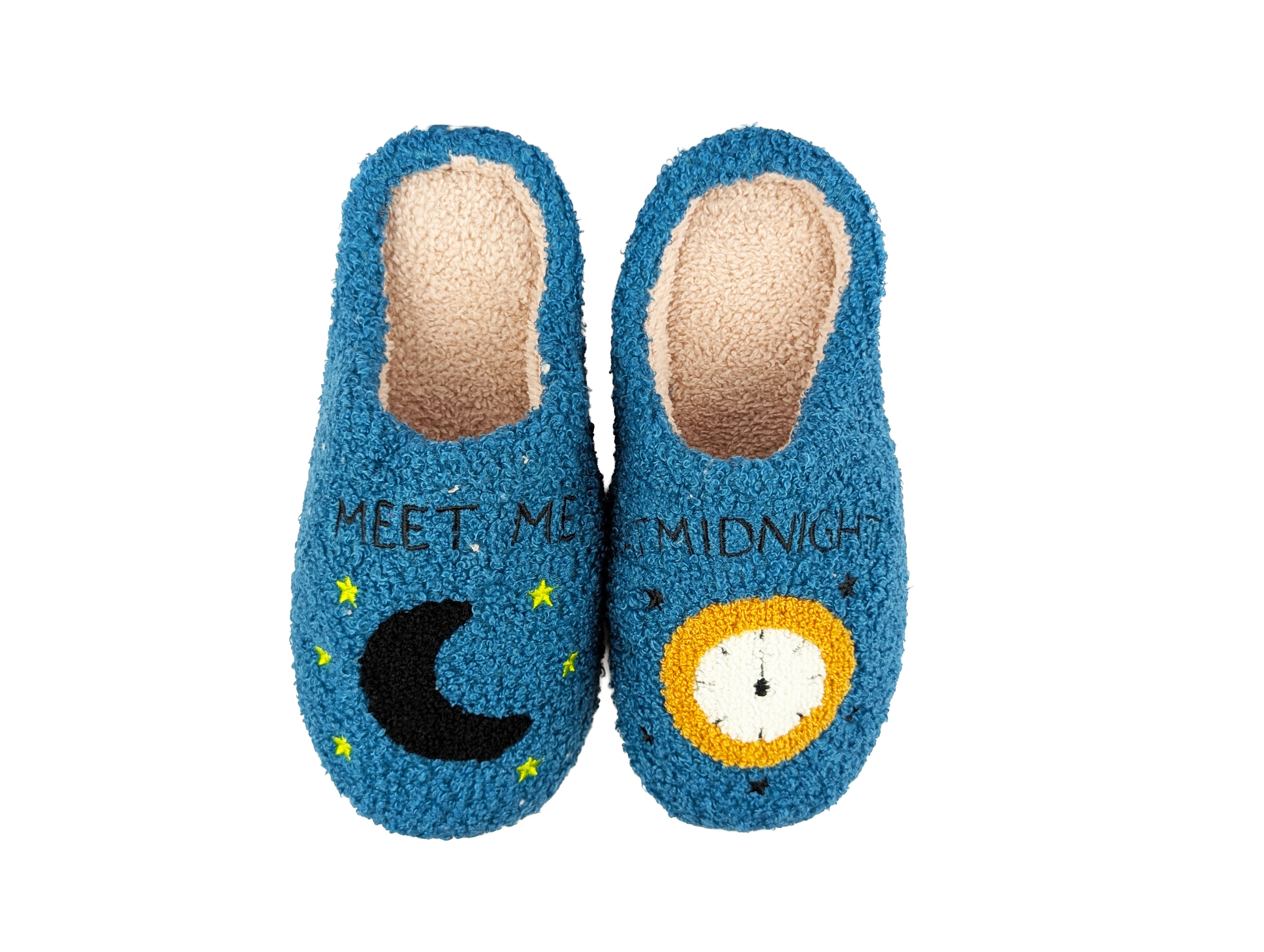 Slide into comfort with a side of temptation💙.  These ultra-soft slippers feature plush interiors and playful embroidery that reads “Meet Me at Midnight” — complete with a crescent moon and clock face. Perfect for curling up with your favorite spicy read or sneaking around for a little after-dark fun.