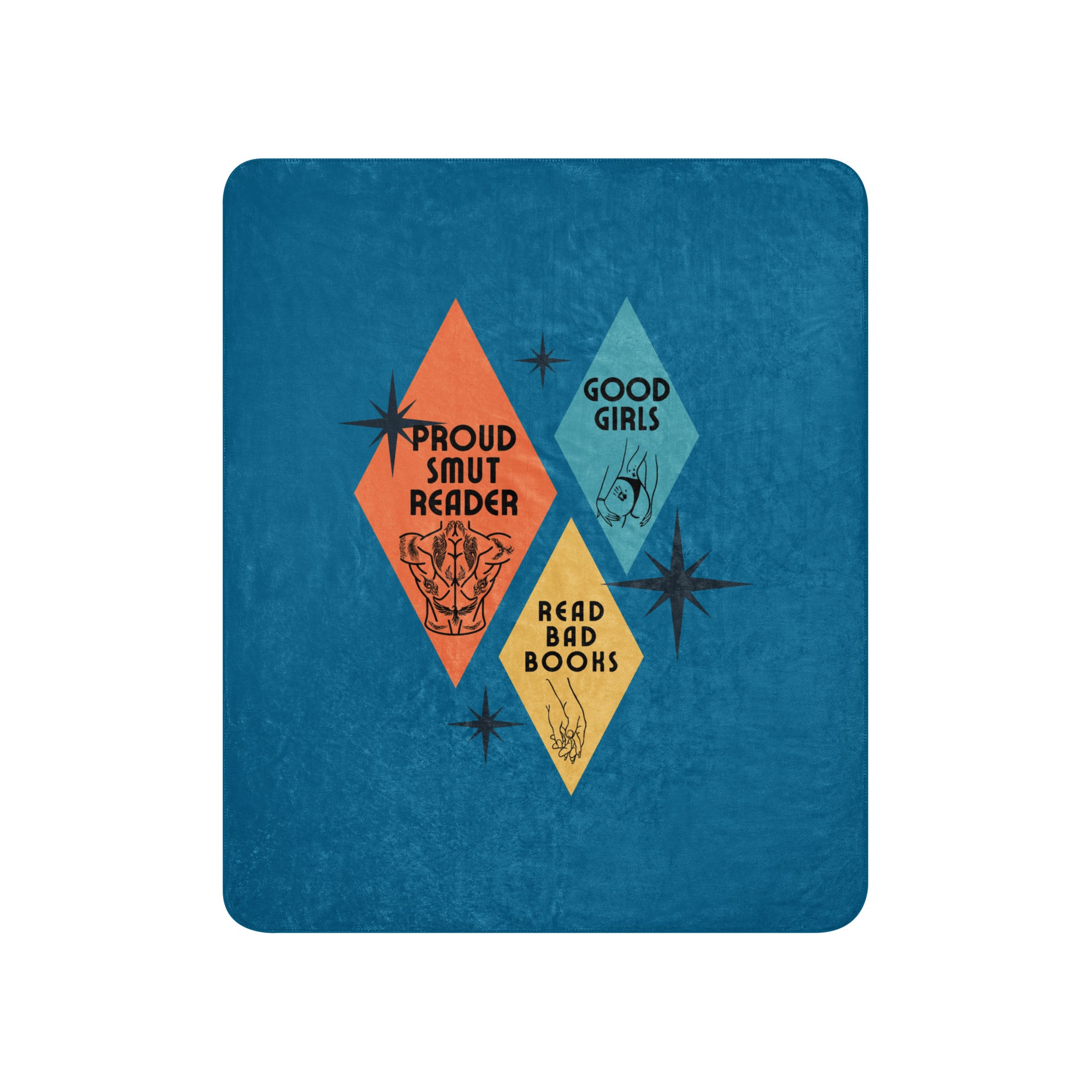 Show off your spicy side loud and proud with this retro-inspired “Proud Smut Reader” blanket! Featuring bold diamond designs with cheeky phrases like “Good Girls Read Bad Books” and playful illustrations, this blanket is perfect for every unapologetic romance lover.